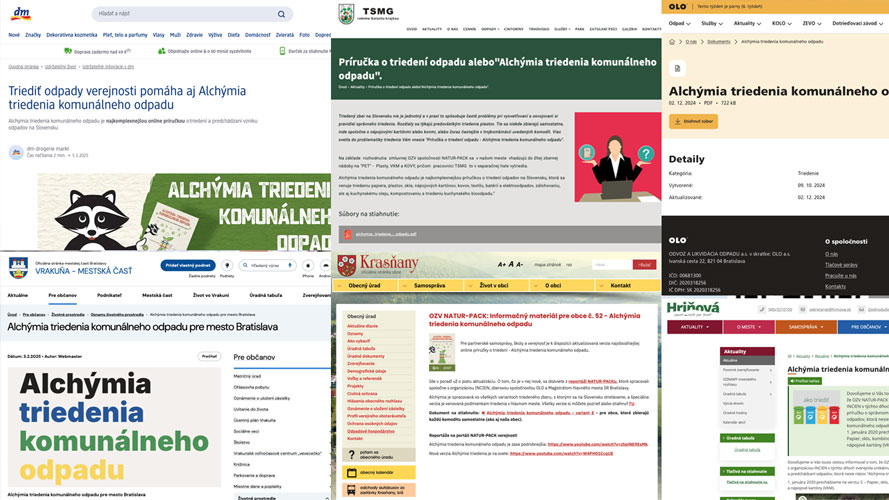 Slovo dalo slovo, spojili sme sa s neziskovou organizáciou INCIEN a autorkami pôvodnej verzie Barborou Nedělkovou a Barborou Šablovou. Do témy sme priniesli 6 rôznych variantov systému triedeného zberu, aké sa vtedy na Slovensku vyskytovali, a výsledkom bola prvá verzia Alchýmie, ktorú už mohli využiť všetci občania na Slovensku. Nedali sme jej šíreniu žiadne obmedzenia. Písal sa rok 2019. A veru sa šíriť začala. Najskôr desiatky, postupne stovky samospráv sa pridávali a ďalšie priebežne pribúdajú k informáciám o Alchýmii a k jej zdieľaniu.