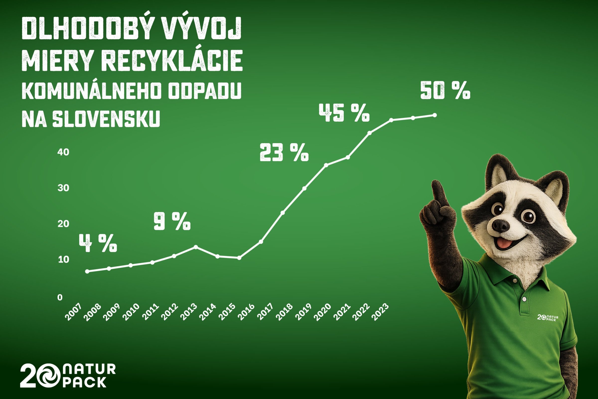 Slovensko v triedení odpadu dlhodobo napreduje. Za 20 rokov, odkedy je tu NATUR-PACK, narástla miera recyklácie komunálneho odpadu zo symbolických jednotiek percent až na viac ako 50 %. Zásadný zlom prišiel po roku 2016 – odvtedy financovanie triedeného zberu v plnej miere zabezpečujú organizácie zodpovednosti výrobcov. Výsledok? Prudký rast, stabilný systém a citeľné zlepšenie oproti minulosti.