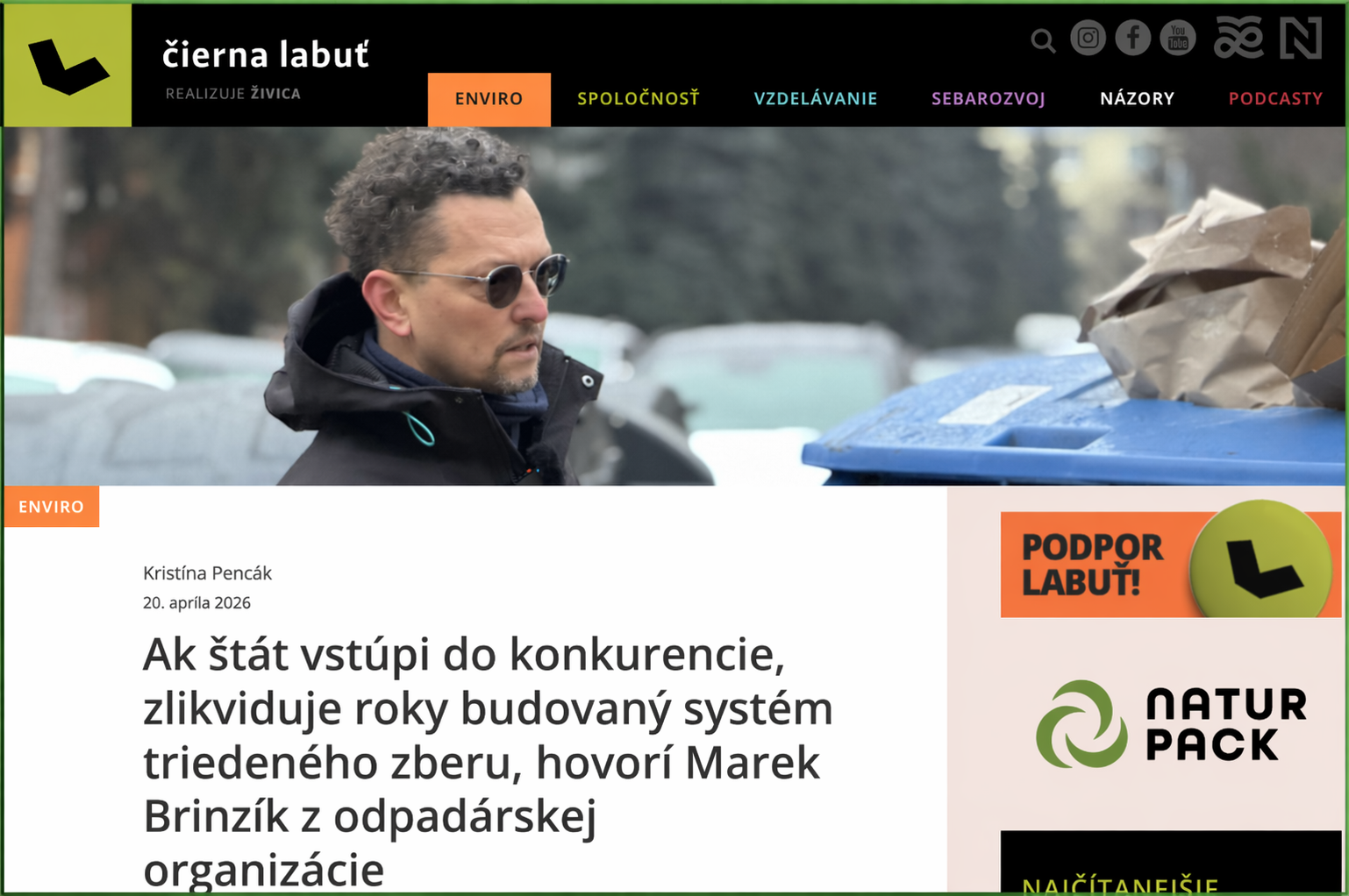 Portál čiernalabuť/DenníkN prináša dôležitý rozhovor s našim riaditeľom pre komunikáciu a marketing Marekkom Brinzíkom, k aktuálnej situácii s legislatívnymi zmenami, ktoré môžu zásadným spôsobom zmeniť celý dve dekády budovaný sektor triedeného zberu. OZV NATUR-PACK je v tejto oblasti aktívnym prvom a na rôznych platformách (KC OBALY, RÚZ) sa usiluje argumentovať v legislatívnom procese a presvedčiť poslancov i všetky relevatné subjekty a inšitútcie, aby sa legislatíva nemenila bez odbornej diskusie a na základe overených dát.